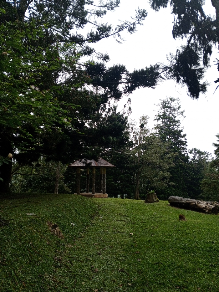 Lush green lawn slopes upward towards a gazebo. The structure is constructed of dark wood, blending into the wooded background of tall, dense trees. A fallen log sits to the right of the gazebo, and a tree stump is partially visible in the center. Overhanging branches of trees frame the top of the shot, partially obscuring the overcast sky.
