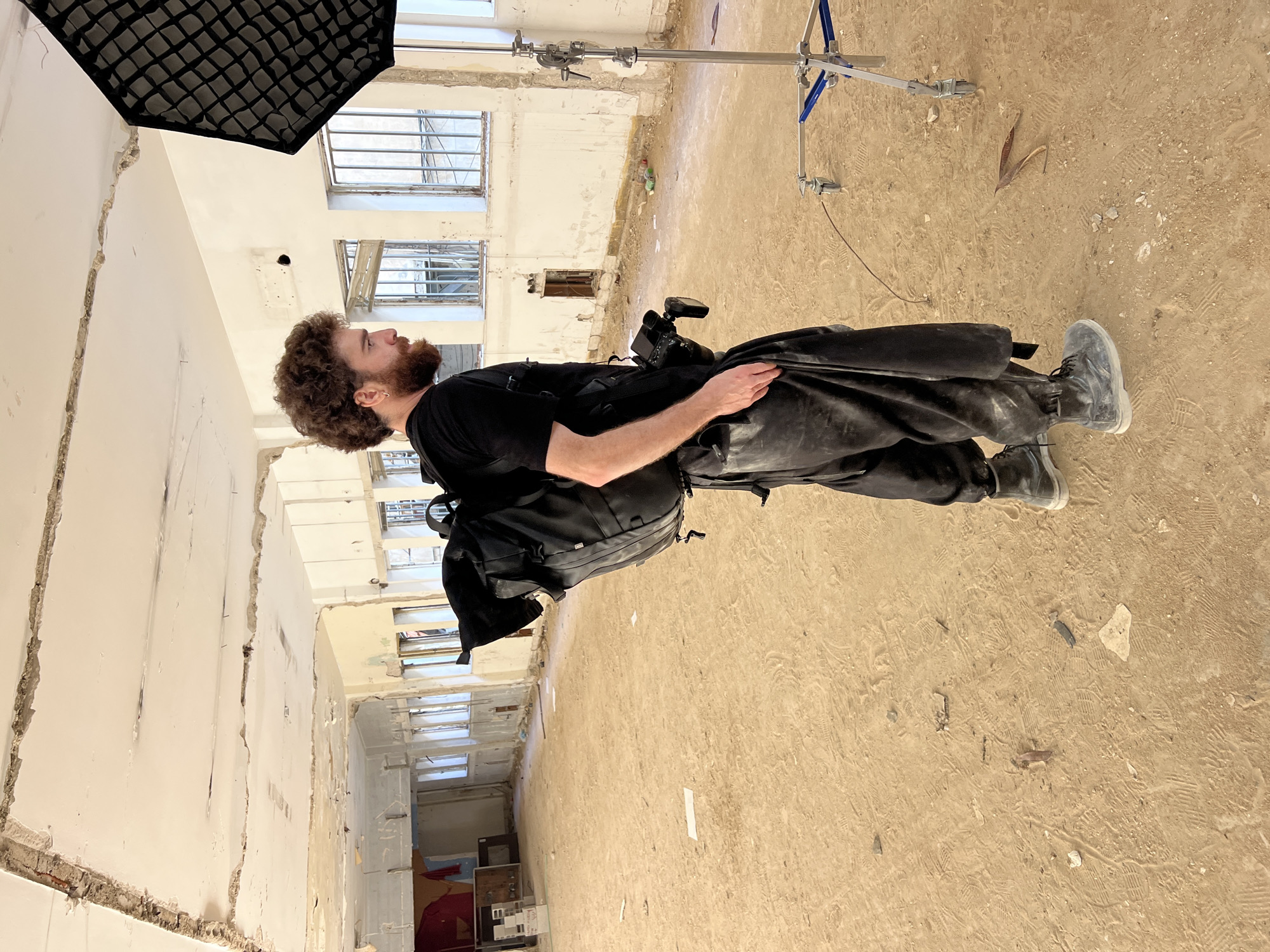This image depicts a single male individual and photography equipment within a large, derelict interior room, stated to be located in Tel-Aviv, Israel. The room features a light brown, sandy earth floor covered extensively with various footprints, small pieces of paper, dried leaves, and other debris. The walls are primarily white, but exhibit significant damage with large sections of peeling paint exposing raw concrete and underlying construction materials. Multiple rectangular windows with security bars are visible along the far and right walls, allowing ambient light to enter. The white ceiling shows extensive damage, with large sections of plaster missing, revealing rough concrete and structural elements. In the far left background, indistinct objects are stacked, including what appears to be draped red fabric. The individual is an adult male with medium-length curly brown hair and a full brown beard, wearing a silver hoop earring in his left ear. He is dressed in a black short-sleeved t-shirt, a large black backpack, loose-fitting black pants (possibly work overalls), and dark work boots. A camera body with a lens is attached to his right hip via a strap or holster. He stands facing away from the viewer's immediate left, looking towards the right side of the frame. His right hand is placed inside his pants pocket. To the right of the individual, a large black softbox with a grid attachment is mounted on a silver light stand equipped with caster wheels. The overall scene suggests a workspace or set within an abandoned or actively deconstructed building. No specific street-level location within Tel-Aviv is discernible from the image content.