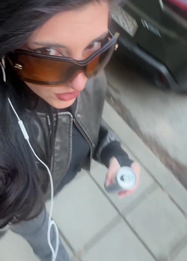woman walking outdoors. She is holding a silver can in her right hand, wearing sunglasses, a black top, a grey leather jacket, and jeans. She also has earbuds in her ears. The background shows cars parked along a street and some trees. The video appears to be shot on a mobile phone, and the camera moves as the woman walks.