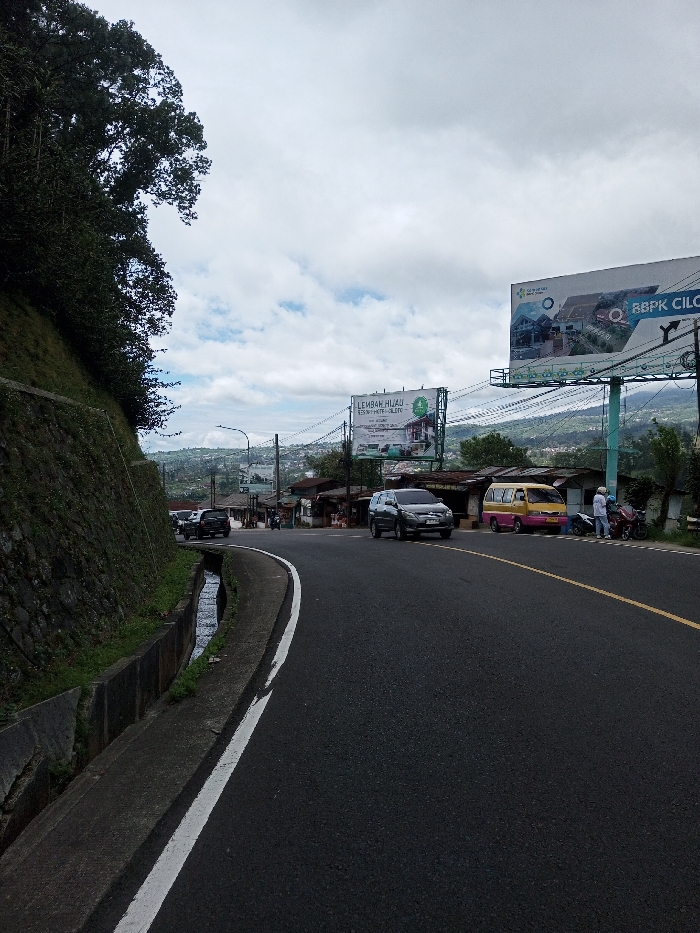 The image depicts a daytime scene on a curved asphalt road in the city of Phoxay, Laos, under an overcast sky with patches of white clouds. To the left, a steep, vegetated hillside with dark green trees is supported by a stone retaining wall. A concrete drainage ditch containing water runs alongside the road at the base of the wall. The asphalt road curves to the right, marked by a solid white line on its left edge and a dashed yellow line on its right. A dark grey SUV is in motion, traveling from the right side of the frame towards the left. Further along the curve, a queue of dark-colored vehicles is visible in the distance. On the right side of the road, a yellow and pink mini-van is parked on the shoulder, next to a red motorcycle. Two individuals are standing near these parked vehicles; one is wearing a light-colored long-sleeved shirt and pants. Numerous overhead power lines and utility poles are present. Two large billboards are prominently displayed: a lower one on the left advertises "LEMBAH HIJAU RESORT HOTEL CILOTO" with an accompanying building image, and a higher one on the right advertises "BBPK CILOTO" with architectural designs. Beyond the roadside structures, a valley extends with distant green hills and scattered buildings.