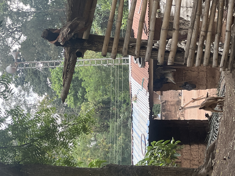 The scene depicts an outdoor, semi-rural environment in Wuinta, Ghana. In the lower-left quadrant, a light brown goat stands on dirt ground, positioned with its hindquarters facing the viewer. To the immediate right, a rustic wooden fence, constructed from horizontal logs, is affixed to a large tree trunk. Beyond this structure, a building with walls constructed of brick or mud/adobe is visible, featuring a corrugated metal roof displaying both faded blue and rusted orange sections. An open archway in this building leads to a dirt path or courtyard beyond. A lighter-colored animal, possibly a small goat, is perched on the corrugated roof. Additionally, two dark tires, a metal bicycle wheel rim, and a green hose are present on the roof. Various bags and unidentified objects hang from the exterior wall of the building. In the background, dense green foliage predominates, crossed by horizontal utility lines. A tall, slender metal lattice tower with two white horn-shaped loudspeakers mounted at its peak is visible rising above the distant trees. A large tree trunk with visible root flare occupies the far left foreground. A small, dark-feathered bird is present on the ground near palm fronds adjacent to the building's entrance.