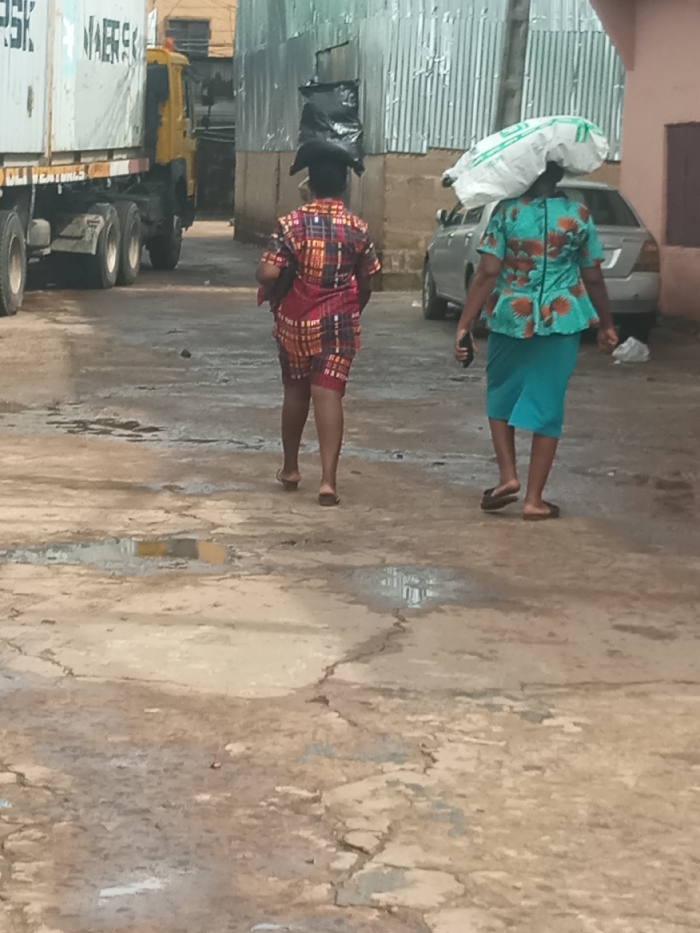 The image depicts a street scene in Onitsha, Nigeria, likely in a commercial or industrial district due to the presence of a container truck. Two individuals, both women, are walking away from the camera on a poorly maintained, damp dirt and cracked concrete road with several small puddles. The individual on the left wears a short-sleeved, multi-colored plaid or checkered top with matching shorts in red, orange, and black tones. She carries a dark, possibly black, object or bag on her head and wears light-colored sandals. The individual on the right wears a short-sleeved teal top with an orange/brown floral or leaf pattern and a plain teal knee-length skirt. She carries a large, white sack on her head and holds a dark-colored smartphone in her right hand. She wears dark-colored flip-flops. In the background to the left, a large white container truck with "MAERSK" branding is partially visible, facing away from the camera. In the background to the right, a light-colored sedan is parked, its rear visible, next to a building with corrugated metal siding. The overall environment appears urban and utilitarian.