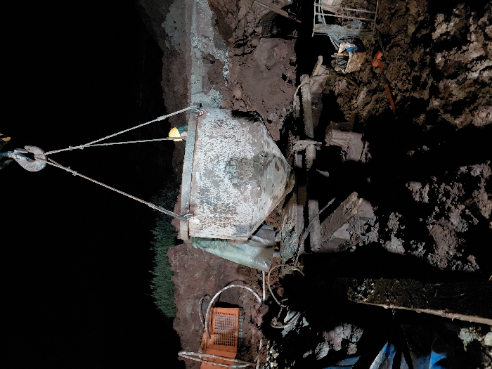 A large, gray, and dirty metal container is suspended in the air by a crane. The container is positioned near the edge of a dirt excavation, with visible vegetation along the rim. A person wearing a hard hat is positioned in the background. Construction equipment and debris are scattered around the area and visible in the background. The scene is dimly lit, possibly at night, and has a busy, industrial atmosphere.
