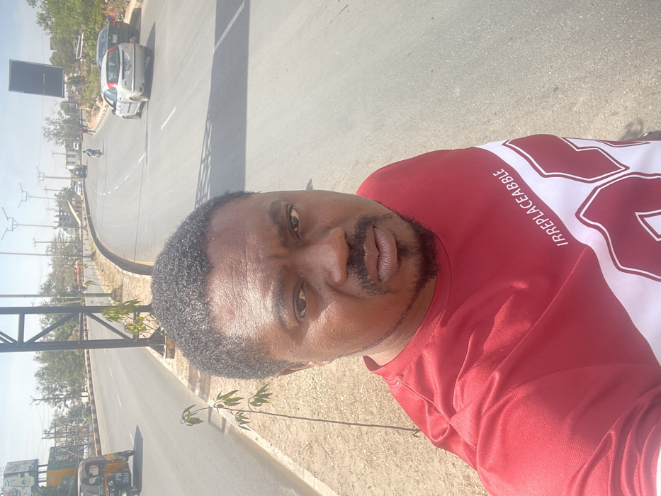 A dark-skinned adult male is depicted in a selfie, centered and filling the lower half of the frame, standing on the roadside in Jos, Nigeria, under a bright, clear sky