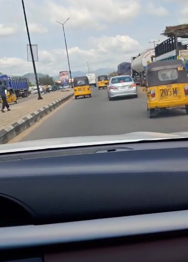 The view from inside a car looking through the windshield shows a road with moderate traffic. Several yellow auto rickshaws, a silver sedan, and large trucks are visible. The road has a concrete median. Streetlights line the side of the road. The sky is cloudy. Mountains are visible in the distance. The car is moving at a slow pace.