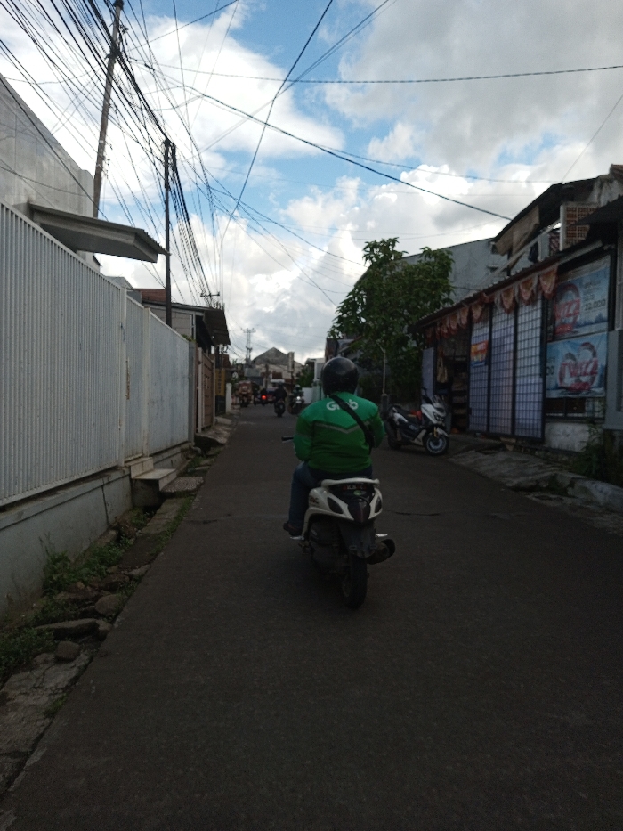 An outdoor street scene in Serpang Shalli, Bhutan, captures a narrow asphalt road receding under a sky with scattered white clouds against a blue backdrop. In the midground, an individual, viewed from the rear, operates a white scooter. The rider wears a dark helmet, a prominent green long-sleeved jacket featuring a white "Go" logo on the back, and blue jeans. To the immediate left, a tall, light-colored corrugated metal fence borders the road, with a narrow concrete drainage channel and minimal vegetation at its base. A series of utility poles supporting a dense array of overhead electrical and communication wires dominate the upper left frame. On the right, a building with a dark, tiled roof and decorative eaves displays a storefront with multiple large advertisements, one clearly visible with text "IZZ" and "22.000". A white scooter is parked adjacent to this building. Further down the street, additional buildings and several distant motorcycles with riders are discernible. The overall lighting suggests daylight conditions.