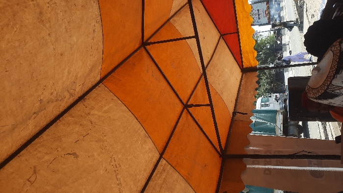 The image depicts a street scene in Panshekara, Nigeria, observed from beneath a canopy structure. The canopy's underside occupies the upper portion of the frame, showcasing a patchwork of worn orange and tan fabric panels supported by a black metal framework. Some fabric sections feature a scalloped edge along the lower perimeter. Through the opening beneath the canopy, a sunlit outdoor environment is visible. A paved or dirt road traverses the midground. On the left, a white truck with a green tarp covering its cargo bed is partially visible, either parked or in motion. Further into the scene on the right, another large white truck is partially obscured. Multiple individuals are present on the street. One person, dressed in a white garment, walks towards the left. Another individual, wearing dark clothing, stands on the right side of the street near a visible plume of smoke, possibly from a small fire. Road barriers or dividers are present along the street. In the immediate foreground, partially obscured by the canopy's support structures, are the heads and upper torsos of at least two individuals seated. One person wears an orange garment, while another has a patterned fabric covering part of their head or shoulders. A white rectangular object with dark markings, possibly a sign or pillar, stands on the left. Trees with green foliage are visible in the background. The scene is illuminated by bright daylight.