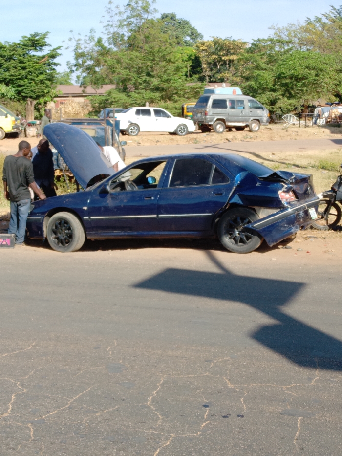 The image depicts a roadside scene in Kakuri Gwari, Nigeria, featuring a dark blue four-door sedan with significant damage to its rear passenger side, including a crumpled trunk, bumper, and rear quarter panel