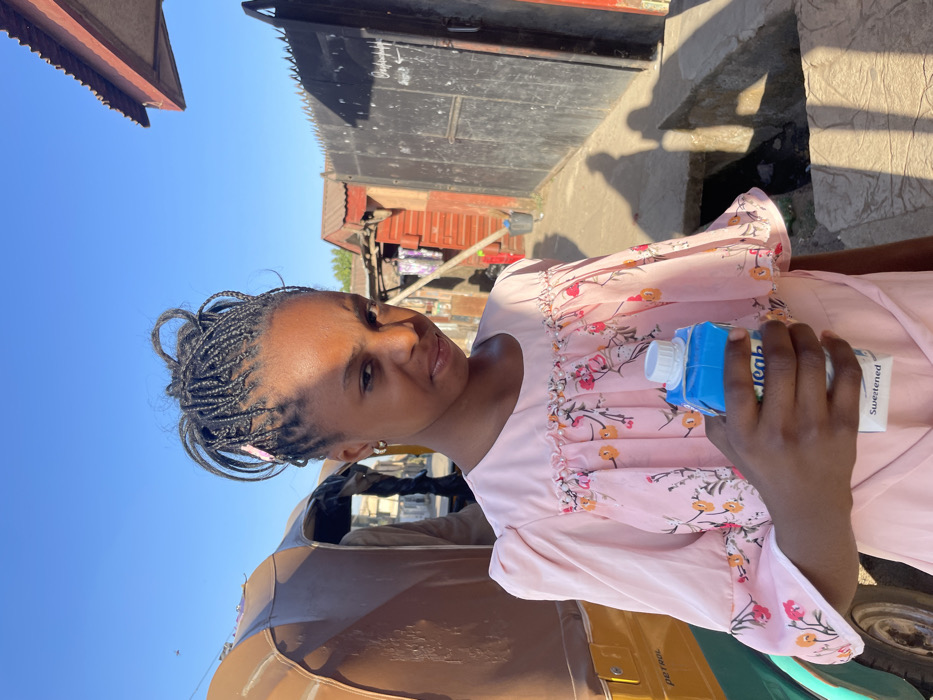 This image depicts a young female standing outdoors on an unpaved urban street or alleyway in Jos, Nigeria. The subject, of dark complexion, has numerous small braids styled upwards with pink accessories and wears small silver hoop earrings. She is dressed in a light pink dress featuring puffed sleeves and a floral patterned bodice (pink, orange, green, white flowers) adorned with small white beads. In her right hand, she holds a small blue and white carton beverage, partially labeled "Teab" and "Sweetened." Her facial expression is characterized by a furrowed brow and slightly tightened lips, with harsh direct sunlight casting a significant shadow across her face. To the left of the subject, a brown and yellow three-wheeled auto-rickshaw (Keke Napep), partially visible, bears the word "PETROL" on its side, with a person's limb visible within its cabin. The background to the right features a tall, dark metal gate topped with security spikes. Beyond this gate, several informal structures with corrugated metal roofs and walls are visible, one showing hanging textiles. An open drainage ditch runs along the right side of the frame on the ground, which appears uneven and contains debris. Long, sharp shadows are cast on the ground to the right of the subject, indicating strong overhead sunlight under a clear blue sky.