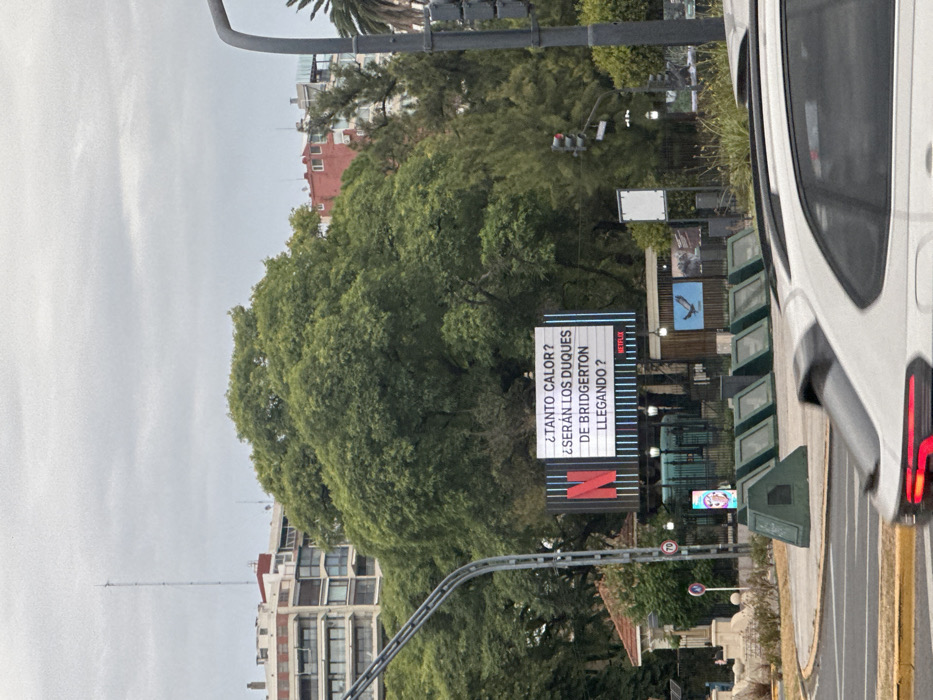 vertical billboard with a Netflix advertisement. The ad text is in Spanish, asking "So much heat? Are the Dukes of Bridgerton arriving?". A large red Netflix logo is visible below the text. The billboard is situated among trees and a traffic light pole. Street signs and buildings are visible in the background. A part of a white vehicle is captured on the right edge of the frame. A speed limit sign with the number "70" can be seen near the billboard.