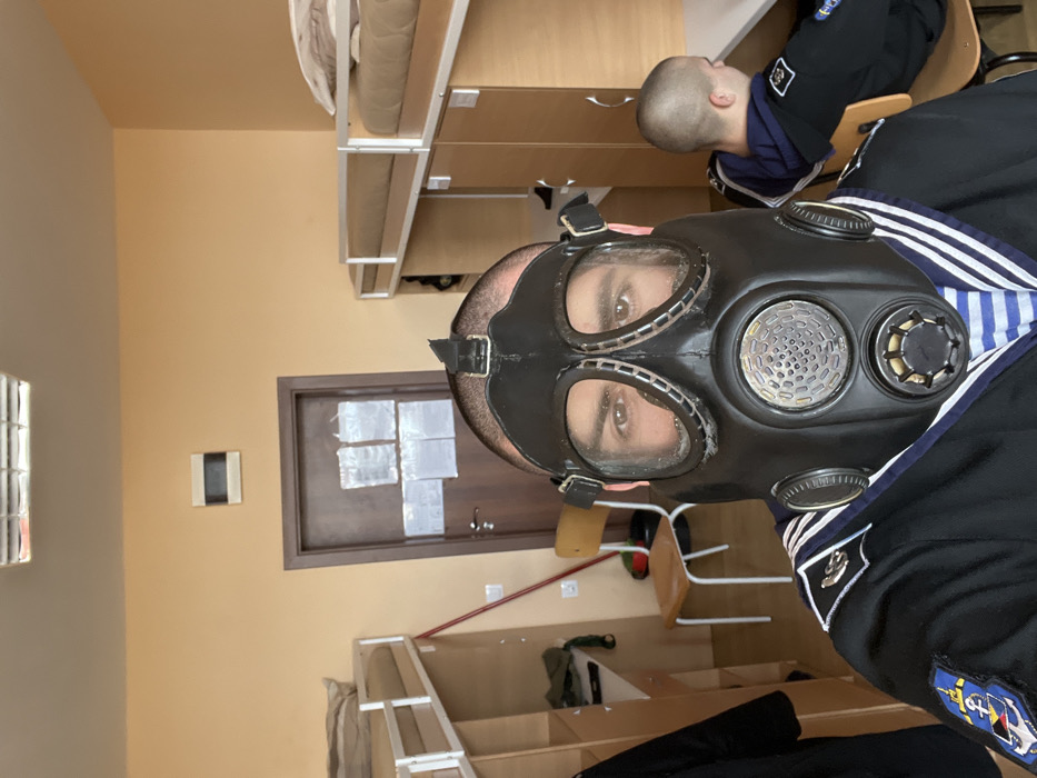 An interior view of a dormitory room in what appears to be the Nikola Vaptsarov Naval Academy in Varna, Bulgaria, is presented. In the foreground, a male individual in a dark blue naval uniform, complete with white striped collar, shoulder insignia, and a sleeve patch featuring a crest, is depicted wearing a black gas mask. His eyes are visible through the mask's clear eyepieces. He is holding the camera to capture a selfie. In the background, to the right, a second male individual with a shaved head is seated at a wooden desk, facing away from the camera, wearing a dark blue garment. The room features light peach-colored walls, a white ceiling with a rectangular fluorescent light fixture, and two sets of metal-framed bunk beds with integrated wooden desks and storage units. A dark brown wooden door with multiple white papers taped to it is visible on the left, next to which a wooden chair and a red pole lean against the wall. A small rectangular vent or fixture is present on the wall above the door.