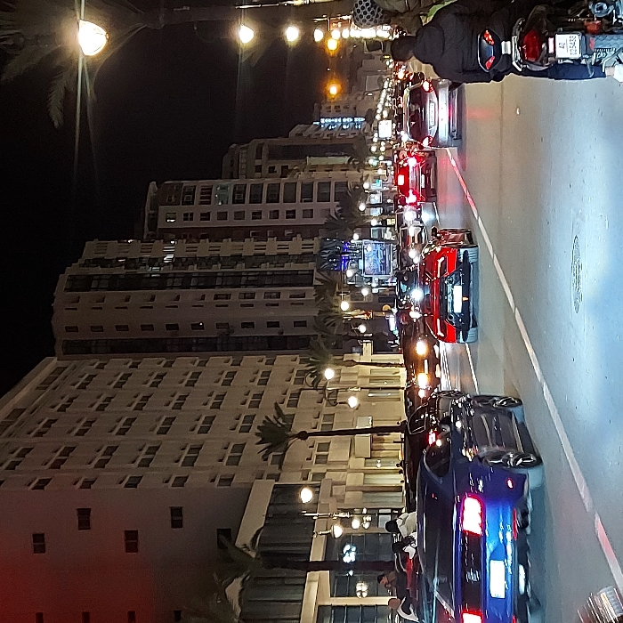 A nighttime urban scene shows a street lined with tall, multi-story buildings. Traffic, including cars and a motorcycle, fills the roadway, their headlights illuminating the scene. Palm trees and streetlights line the sidewalk, casting a warm glow on the architecture. The buildings have a white facade with numerous windows. The sky is dark, and the overall impression is of a busy city street at night.