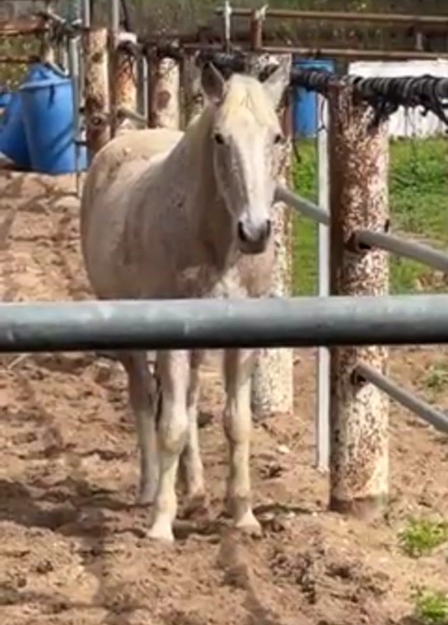 - "A stationary medium shot captures a single, speckled, light-colored horse standing inside a fenced enclosure with a sandy ground" by FM-Uyq9d2, licensed under CC BY 4.0