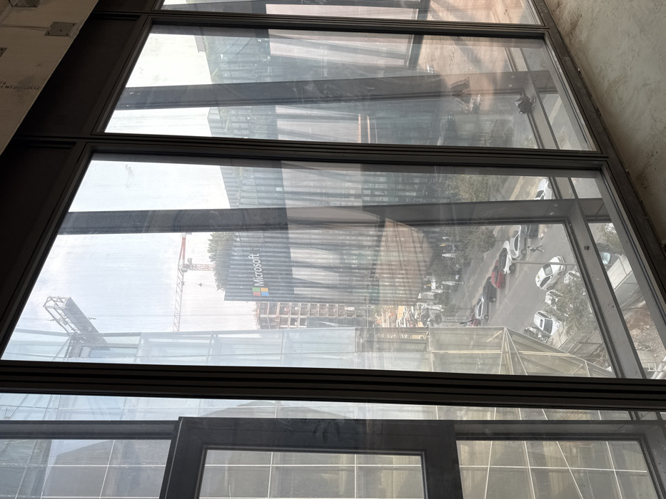 The image displays an urban exterior scene in Herzliya, Israel, viewed through multiple large, dark-framed glass window panes from an elevated interior vantage point. The windows exhibit streaks and dust. The interior floor visible in the lower right foreground is a plain concrete surface. In the midground, a prominent, modern multi-story building with a dark, reflective glass facade features the colorful "Microsoft" logo on its upper section. The building's rooftop is adorned with green landscaping. To the left of this building, a multi-story building frame under construction is visible, characterized by exposed concrete or steel. A red and white tower crane extends above this construction, and another lighter-colored crane or maintenance structure is positioned higher in the sky to the far left. Below the buildings, a paved street runs horizontally across the frame, occupied by numerous parked vehicles of various colors, including white, red, and dark tones. One individual is visible walking on the street or a pedestrian crossing, wearing dark clothing. Alongside the street, sections with white outdoor umbrellas, tables, and chairs indicate commercial establishments. The sky above is a pale blue with visible haze. Reflections of the interior environment are present on the window glass.