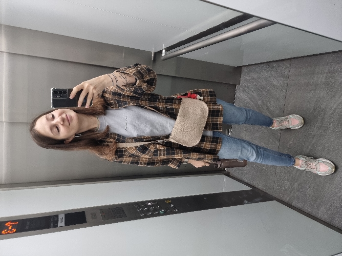 A single female individual is depicted in an elevator, likely located in a building within Ramat Gan, Israel. The subject, appearing to be in her early to mid-20s, has medium-length brown hair and a light complexion, captured mid-smile. She is wearing a brown and black plaid long-sleeve shirt over a light gray t-shirt, light blue skinny jeans, and light pink and gray athletic sneakers. A light beige, textured crossbody bag with a red decorative element is worn over her left shoulder. Her right hand holds a dark-colored smartphone, which she is using to capture a mirror selfie. A dark brown water bottle is held in her left hand. The elevator interior features brushed stainless steel walls, a dark gray mottled tile floor, and a vertical control panel on the left wall. This panel displays an illuminated orange "E-4" indicator and multiple dark buttons. A horizontal metallic handrail is visible on the right wall, which also incorporates a reflective surface where parts of the subject's reflection are visible.
