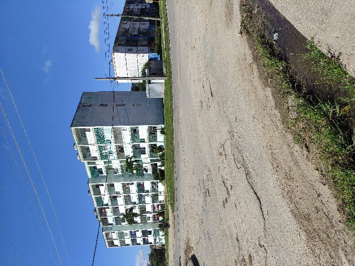 This image depicts a residential scene in Ciego de Ávila, Cuba, under a clear blue sky with sparse clouds. The foreground features a weathered, light-colored asphalt or concrete road surface, exhibiting numerous cracks and areas of erosion. Along the lower right edge, a narrow, unpaved ditch or gutter runs parallel to the road, containing standing water and a strip of green grass and weeds. In the midground, two multi-story apartment buildings are visible. The prominent building on the left is a six-story structure, appearing light green or off-white, with visible signs of weathering and discoloration. Each floor features multiple balconies, many of which have clothes hanging to dry. Two small palm trees stand in front of this building at ground level. To the right of the first building, a utility pole with multiple overhead wires extends into the sky. A small, light-colored utility box or shed is positioned behind this pole. Further right and more distant, a second, smaller, multi-story building, also exhibiting signs of wear and neglect, is partially visible. Additional utility wires stretch across the upper portion of the frame. No individuals are visible in the scene, though the hanging laundry indicates human habitation. A bicycle is partially visible near the base of the prominent building on the left.