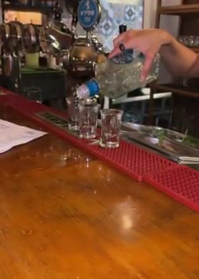 A person is pouring a clear liquid from a decorative glass bottle into three small shot glasses on a wooden bar counter. The bar is equipped with draft beer taps and shelving stocked with bottles. A red rubber mat lies beneath the shot glasses, with some green herbs nearby. The lighting is dim and the background has a casual restaurant feel.