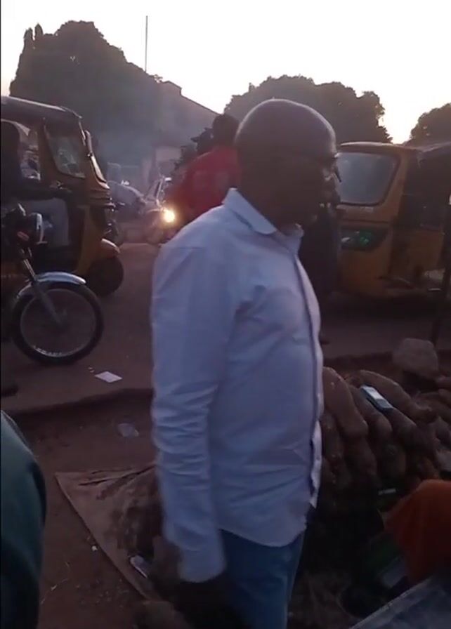 bustling outdoor marketplace, likely in a developing country. The ground is reddish dirt, littered with trash. People are walking around, and there are some yellow three-wheeled vehicles, possibly auto rickshaws, parked nearby. Piles of what appear to be cassava roots are visible in the center of the scene. A man in a light-colored shirt and jeans is seen standing in the foreground, and a woman in an orange dress is sitting near the cassava roots. The overall atmosphere suggests a busy, informal commercial setting at what seems like dusk or dawn.