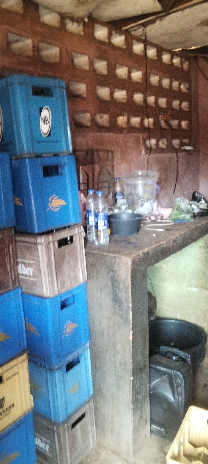 The image depicts a cluttered, semi-enclosed storage or sales area, with no individuals present. On the left, multiple stacks of plastic beverage crates are arranged, with predominant colors being blue and light brown/beige. Identifiable markings include an "NB" logo on a blue crate, a yellow wheat/barley emblem on several blue crates, "Gulder" text on a brown crate, and "GUINNESS" on a yellow crate. The crates are stacked irregularly, some appearing full. To the right, a roughly constructed, dark-stained concrete counter or table extends horizontally. On its surface, several clear plastic water bottles with blue caps are visible, alongside a black plastic bowl. A large, clear plastic container with a lid, holding various contents, sits further back. A white plastic bag containing green leafy produce is on the far right of the table, next to some small white globular objects, possibly onions, and a coiled white cable. Electrical wiring and a white outlet are visible on the reddish-brown wall above the table. Beneath the counter, a large black plastic tub and a black portable speaker are positioned on the floor. The background wall is constructed of reddish-brown perforated blocks, suggesting a ventilation system or decorative pattern, with a damaged or unfinished ceiling section visible at the top. The overall environment appears functional but untidy. The location is Unknown, Unknown.
