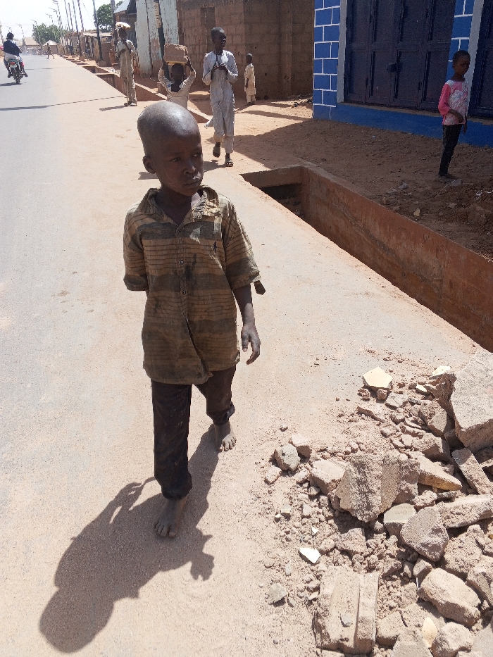 This image captures a street scene in Tempure, Nigeria, under bright daylight. In the foreground, a barefoot young boy, estimated to be between 5 and 8 years old, stands on sandy ground. He wears a soiled, vertically striped short-sleeved collared shirt and dark trousers. The boy has a shaved head, and his left arm terminates in an apparent amputation stump below the elbow. His right hand is partially visible and also appears to have a malformation or absence. He casts a distinct shadow to his right. Adjacent to the boy, on the right side of the frame, lies a pile of broken concrete, bricks, and construction debris on the sandy surface. This debris is situated next to an exposed concrete drainage channel that runs parallel to the road. The background features a paved or hard-packed dirt road extending into the distance. Several individuals are visible in the midground, walking on the unpaved shoulder of the road. One child is seen carrying a rectangular object on their head. Another individual wears a light-colored, long garment and walks. Further down the road on the left, a person on a motorcycle is present. Buildings constructed from light-colored materials line the street, with a more distinct structure on the right featuring blue-painted brickwork and dark doors. The overall environment suggests an arid, dusty setting with clear skies.