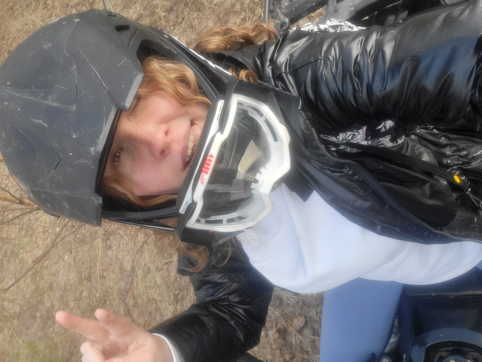 A woman wearing a black helmet and white framed goggles is smiling at the camera. She is wearing a shiny black jacket over a white shirt and light blue pants. She is giving a peace sign. The background appears to be dry grass and small branches. No city is visible, so determining the location in Марковский, Russia, is not possible.