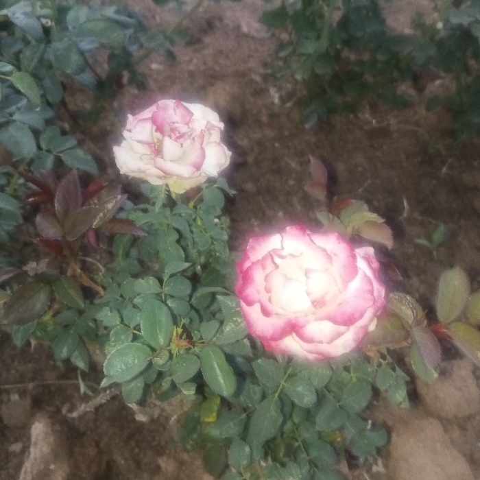Two roses, one fully open with white petals edged in vibrant pink, the other more closed, displaying similar coloration. Both are surrounded by lush green leaves, some tinged with burgundy hues. The flowers stand out against a background of soil and other foliage, hinting at a garden setting. The lighting appears soft, contributing to the overall gentle and inviting aesthetic of the scene.