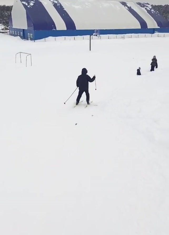 A distant video shows a person skiing on a flat, snowy field under a cloudy sky. The person is wearing dark clothing and falls down, with skis splayed out. In the background, there is a large structure with blue and white stripes, a soccer goal, and a few people standing on a small hill.