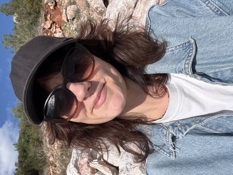 A female subject, appearing to be in an outdoor environment consistent with Kamenovo, Montenegro, is depicted in a close-up, head-and-shoulders shot. She has dark brown, wavy hair and wears a black baseball cap, large brown-tinted sunglasses, and a small silver hoop nose ring in her left nostril. Her attire includes a light blue denim jacket over a white t-shirt, with a thin silver chain visible around her neck. The subject is looking directly at the camera with a subtle smile. The background features a sunny, rocky hillside composed of reddish-brown and lighter stone, interspersed with sparse green vegetation, under a clear blue sky with minimal cloud cover.
