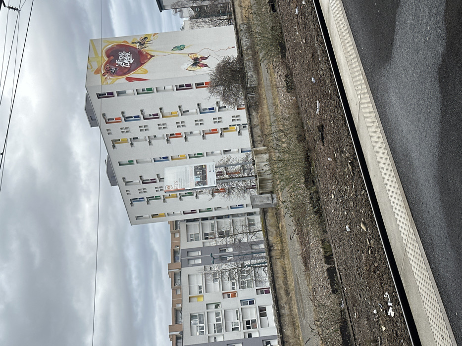 The image displays an urban scene in Saint-Louis, France, captured from the perspective of a train platform, looking towards residential buildings under an overcast sky. In the foreground, a dark grey asphalt train platform with a textured light grey tactile paving strip runs along the bottom edge. Immediately adjacent to the platform are railway tracks, consisting of dark grey ballast stones, visible wooden sleepers, and metal rails. Scattered white debris, resembling paper or plastic, is distributed across the ballast. Sparse, dry, brownish-green vegetation grows in clusters among the tracks. The midground features a low, aged concrete retaining wall, beyond which the ground level appears elevated. Behind this wall, a prominent, multi-story residential building with a bright white facade stands on the right. This building's windows are framed in various vibrant colors including red, orange, yellow, green, blue, and purple. The right gable wall of this building is adorned with a large mural depicting a stylized red and orange heart with yellow accents. Within the heart, indistinct text, possibly "SAUTONS L'EMPRISE," is visible. Two bees are painted near the heart, and below it, a large brown-orange butterfly and a smaller green butterfly are connected by a thin line descending from the heart. Directly in front of this building, a white rectangular sign on a pole displays the letters "BTSC" at the top, accompanied by a logo, and smaller text and imagery below, appearing to advertise a business school. To the left, another multi-story residential building with a lighter grey facade and a mix of colorful window frames and white roller shutters is partially visible. Bare deciduous trees with dark branches are situated between the buildings and the retaining wall, alongside some dense brown shrubbery. The background consists of a uniformly light grey, overcast sky. Thin black lines, indicative of overhead power lines or catenary wires, traverse the upper portion of the frame horizontally. Additional distant buildings are partially visible. No individuals or discernible human activity are present within the scene.