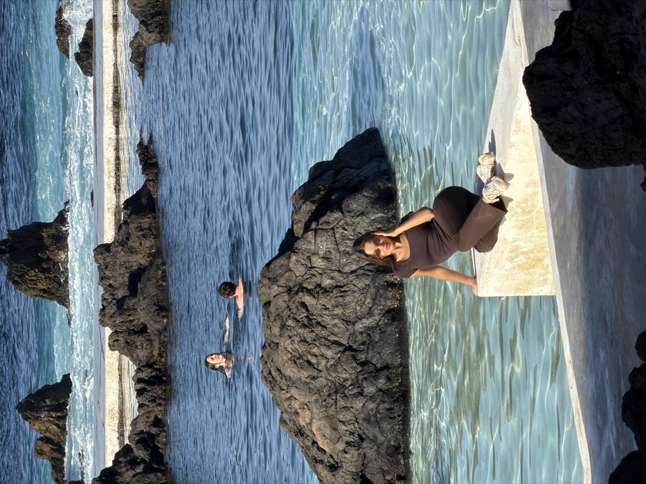 A woman in brown clothing poses on a concrete ledge next to clear water surrounded by black rocks. She wears sneakers and rests one hand on her head. Behind her, two people are swimming in the water, their heads visible above the surface. The backdrop features more black rocks and the ocean with a white wave line. The image is oriented in landscape.