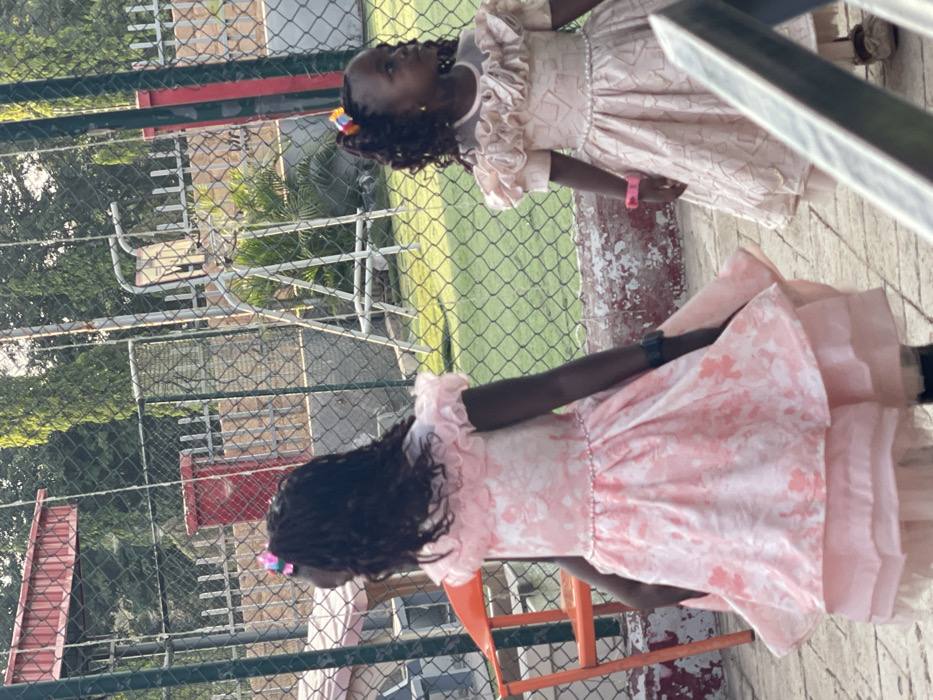 Two young girls in formal pink dresses stand near a green chain-link fence. One girl, facing away from the camera, wears a light pink dress with floral patterns and a ruffled neckline. The other girl, facing sideways, wears a similar light pink dress with a different pattern. Both have dark hair and appear to be outdoors, possibly at an event or celebration. A playground structure with red accents is visible in the background.