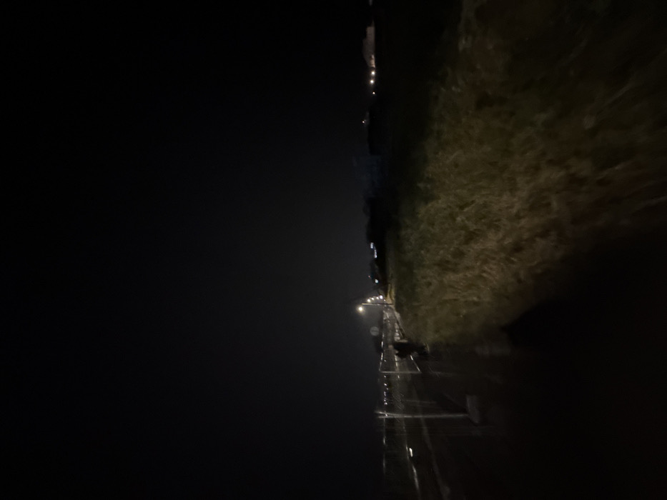 The image displays an outdoor night scene in Meneou, Cyprus. A dark, possibly wet, paved surface occupies the left foreground, bordered by a series of light-colored temporary barriers with white bases. Behind these barriers, near the pathway, one distinct human figure and a potential second are visible as dark silhouettes. To the right of the paved area, a dense field of tall, dry, yellowish-brown grass extends into the midground. Several streetlights illuminate the scene, with one prominent light source positioned in the mid-left. Scattered artificial lights are discernible in the distant background, indicating structures. The sky is dark and featureless. No specific actions or interactions between individuals are discernible.