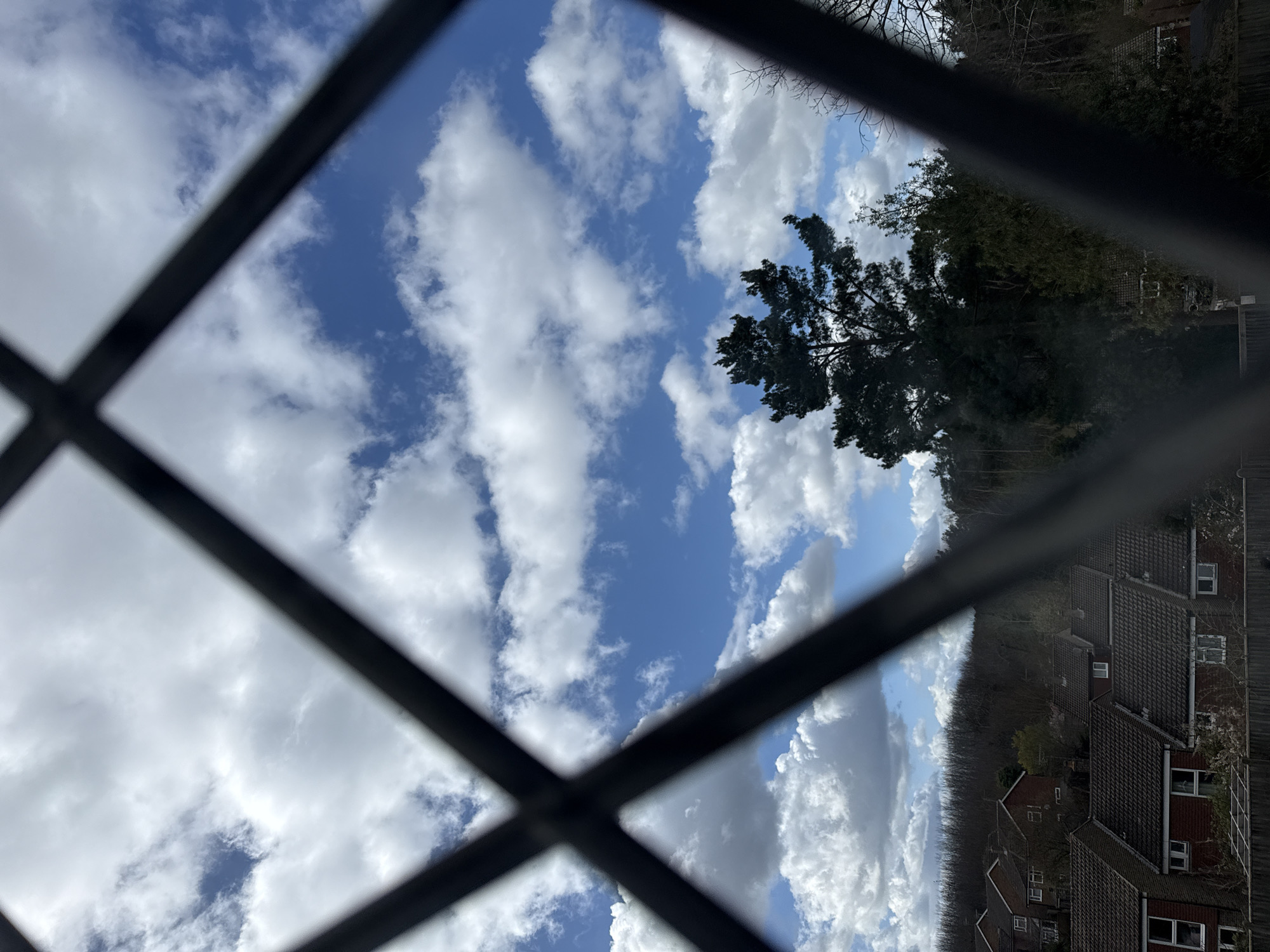 The image displays an outdoor residential scene in Tunbridge Wells, United Kingdom, viewed through a leaded glass window, evidenced by the out-of-focus, dark, diamond-patterned grid obscuring parts of the foreground. The upper section features a partly cloudy blue sky with numerous white cumulus clouds. Below the sky, a dense line of trees, including a prominent dark green conifer in the mid-right, occupies the midground. The lower portion of the image reveals a residential area composed of multiple houses with red-brick facades and dark tiled roofs. A wooden fence is partially visible at the bottom. No individuals or specific actions are present.
