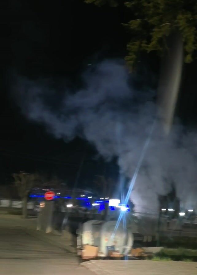 The video depicts a night scene with significant smoke obscuring details. A vehicle is visible near what appears to be a dumpster. The vehicle has its lights on, and these lights are cutting through the smoke. A tree overhangs the top of the frame. Streetlights are visible in the background, as is a stop sign. The scene appears to be on or near a paved pathway.