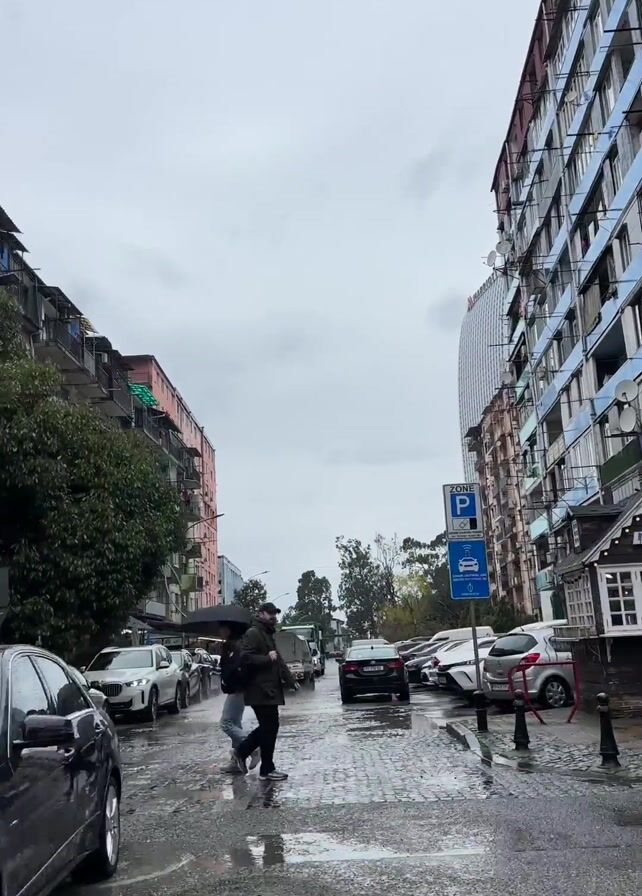 wet street scene on a rainy day. People are walking across the street, some using umbrellas. There are cars driving and parked on the sides of the street. Buildings of various sizes and colors line the street. A parking sign is visible. Some small businesses are open for customers. A tall, modern, white building is visible in the distance.