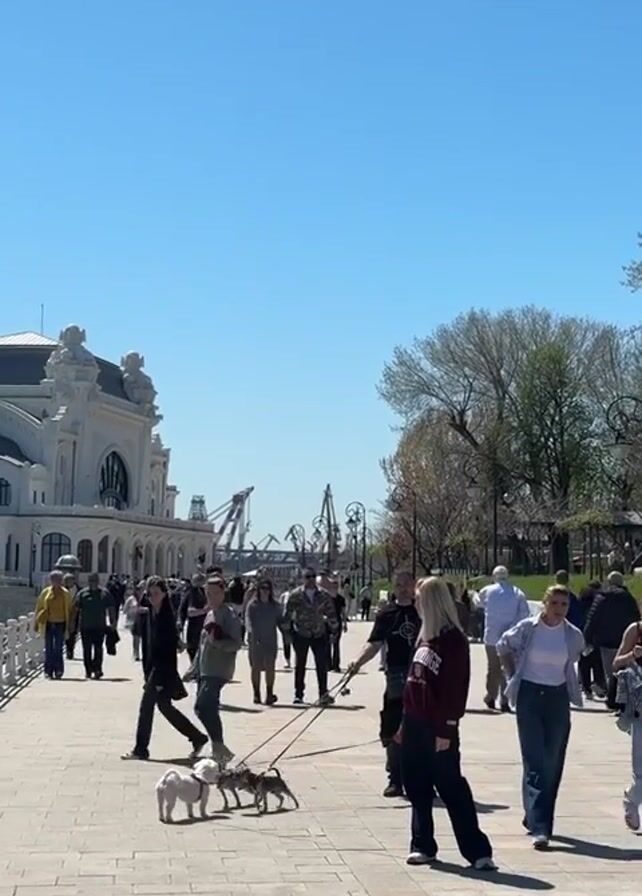 sunny day on a busy outdoor walkway with a large crowd of people walking in various directions. The camera initially captures a wide shot of the scene, including a white, ornate building on the left and trees on the right. In the distance, port cranes are visible. The camera then zooms in on a group of dogs on leashes interacting with each other. There is a small white dog, and two smaller dogs with brownish-gray fur. People walk around them, and the dogs are tethered to their owners. The pavement is composed of large, light-colored rectangular blocks. The sky is clear blue.