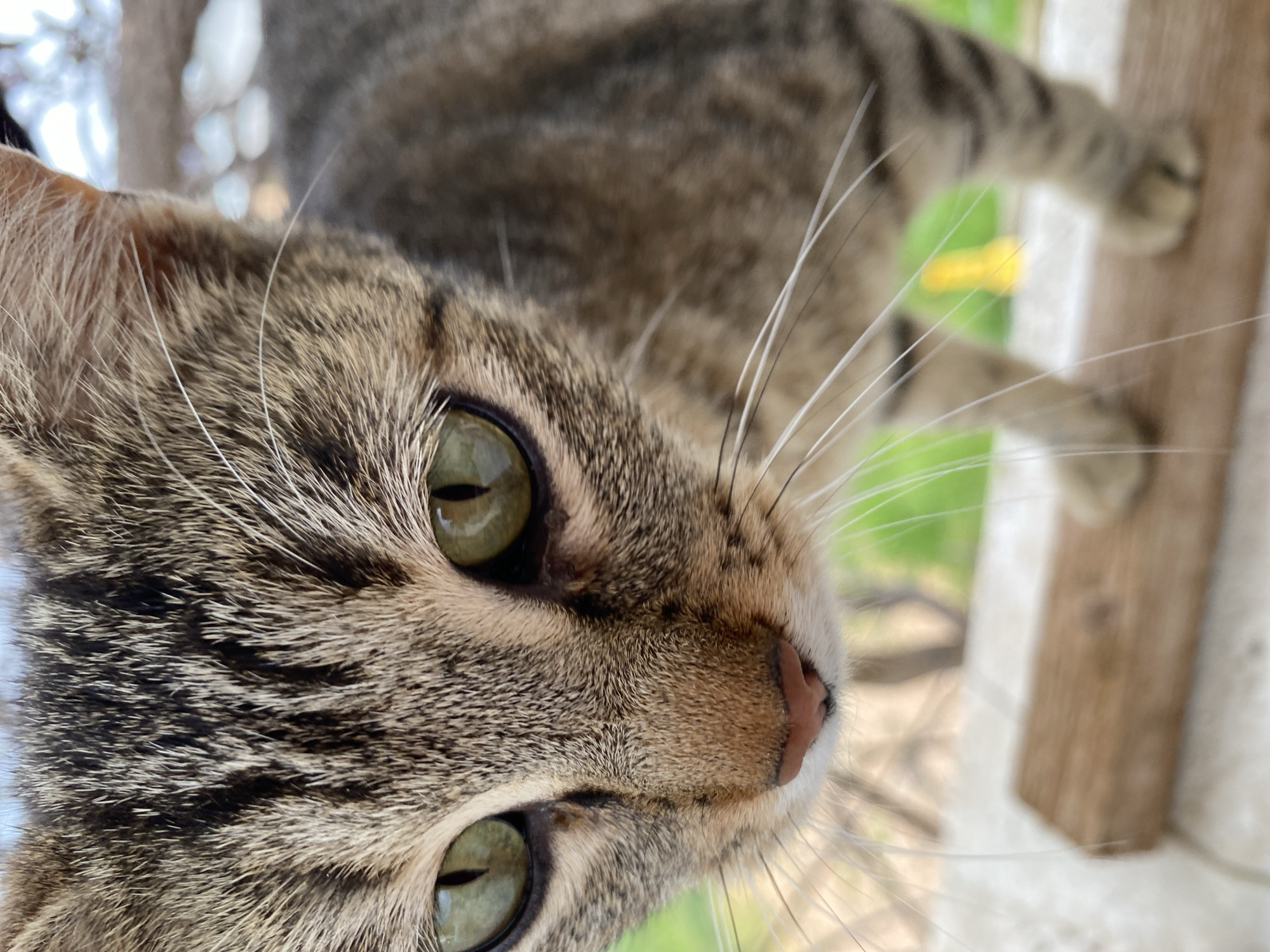 A close-up photograph depicts the head and upper body of a domestic cat, identified as a tabby, in Kunje, Montenegro. The cat's fur displays a pattern of brown, grey, and black stripes, with lighter fur on its muzzle. Its large, round eyes are green with dark pupils, and its nose is pinkish-brown. Numerous long, white whiskers extend from its muzzle. The cat is positioned facing directly towards the camera, with its body angled slightly to the right. It stands on a light-colored, possibly concrete, surface, with a rectangular wooden object situated beneath its front paws. The background is largely out of focus, showing a blurred green area, indicative of foliage or grass, and an indistinct yellow object in the distant background.