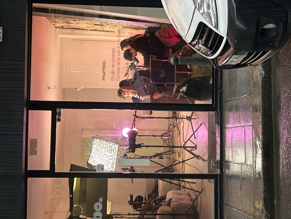 The image depicts a studio space called "mumbo," dedicated to podcast production. The storefront advertises "Studio de podcast: Donnez de la voix à vos idées," and includes the website, mumbo.fr, and email, hello@mumbo.fr. Inside, people are recording a podcast, surrounded by microphones and lighting equipment. A large softbox and additional lights on stands are visible. The reflection shows a car parked outside the window, and the sidewalk is wet. A sign on the floor towards the bottom shows "bo."