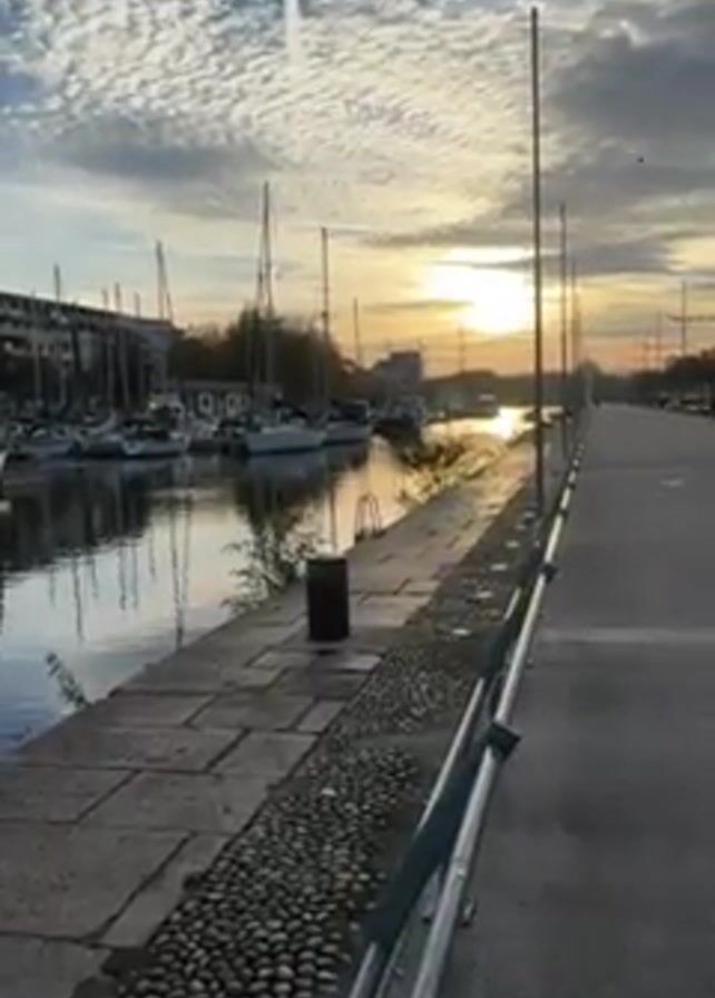 harbor scene at dawn or dusk, with a narrow canal lined with sailboats and buildings in the background. The camera moves along a paved path with a metal railing and bollards. The water is still, reflecting the sky and boats, and the overall lighting suggests a calm, quiet atmosphere.