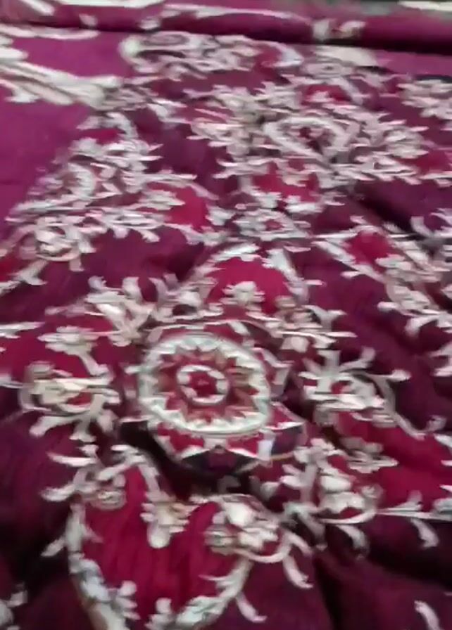 patterned burgundy and white comforter on a bed. The camera is held at a close-up angle, focusing on the details of the comforter's design. A small, white rectangular object sits on the top edge of the bed.