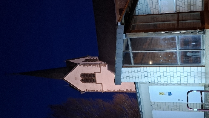 A low-angle shot shows a church steeple against a dark blue sky. The church's facade is faintly lit, revealing arched windows and a pointed roof. Adjacent to the church, a modern brick building is visible. The building features a large window and a white electrical box with a yellow warning sign. A metal rail is positioned near the box. Bare tree branches are at the bottom of the frame.