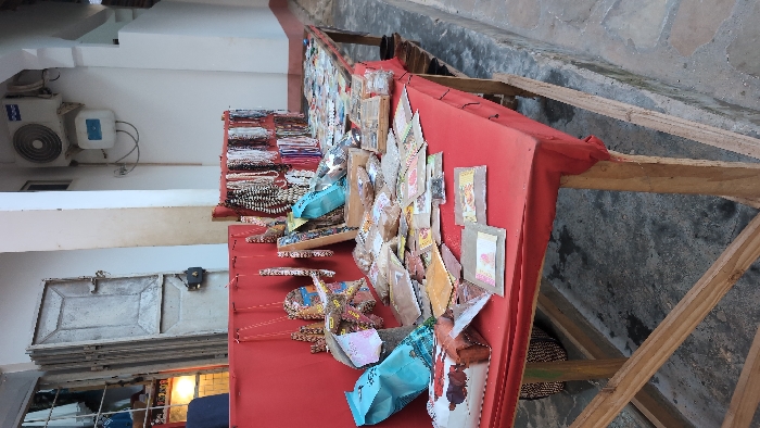 This image depicts an outdoor market stall located on a paved surface alongside a light-colored building in Kendwa, Tanzania