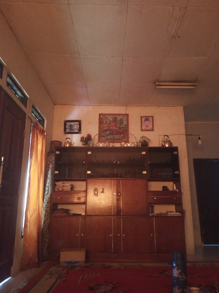 The image depicts the interior of a room within a residential structure located in Fitsinjovana Bakaro, Madagascar. The perspective is a low-angle shot, looking upward towards the ceiling. The ceiling is light-colored, composed of multiple panels with visible seams, showing minor signs of wear or discoloration. A dual fluorescent light fixture is mounted centrally on the ceiling towards the right side. The walls are predominantly light beige. On the left, a dark wooden door frame is partially visible, adjacent to a window covered by a bright yellow fabric curtain that hangs vertically and is drawn to the right. The back wall is dominated by a large, multi-tiered wooden display cabinet or hutch. Above the cabinet, three framed items are mounted: a dark-framed picture on the left, a larger red-framed painting depicting a landscape with structures and water in the center, and a smaller brown-framed portrait of a man on the right. The right wall is partially obscured and appears darker, featuring a bare light bulb suspended from a black metal arm extending from the wall. The wooden cabinet is dark-toned with visible grain, featuring upper sections with glass doors, middle sections with solid wooden doors and open shelves, and lower sections with solid wooden doors. Items resembling stacked papers or books are visible on an open shelf in the middle-left section. On top of the cabinet, from left to right, are: a decorative basket, a silver-colored metal kettle with a black handle, two decorative baskets with artificial flowers, a silver tray, and another silver-colored metal kettle with a black handle. The floor is covered by a red rug with a dark, patterned design. A small cardboard box is situated on the rug in front of the lower left portion of the cabinet. In the lower right foreground, a dark, cylindrical object with white markings, possibly a thermos, rests on the rug. No people are present or depicted in the scene, and no actions or interactions are occurring. The environment is static.