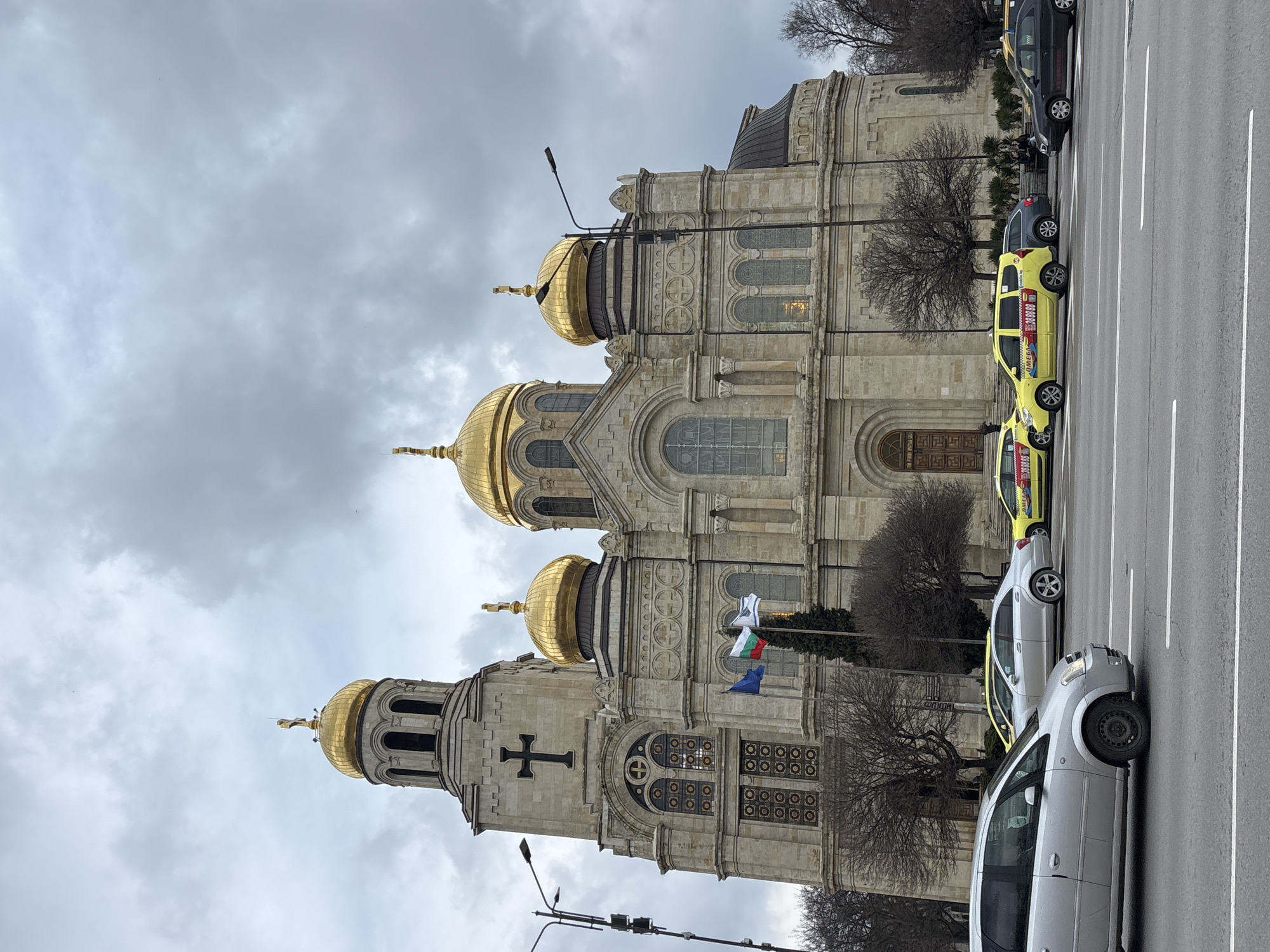 The image captures the Dormition of the Mother of God Cathedral in Varna, Bulgaria, from a ground-level perspective. The cathedral's architecture is prominent, showcasing its gold domes and ornate stone facade. Adjacent to the cathedral is a street with parked cars, including several yellow taxis. The sky is overcast with gray clouds, indicating a cloudy day. The cathedral is the main subject, while the street with cars and the sky serve as contextual elements, setting the scene in an urban environment. No people are clearly visible in the image. The scene is static, with no apparent actions taking place.