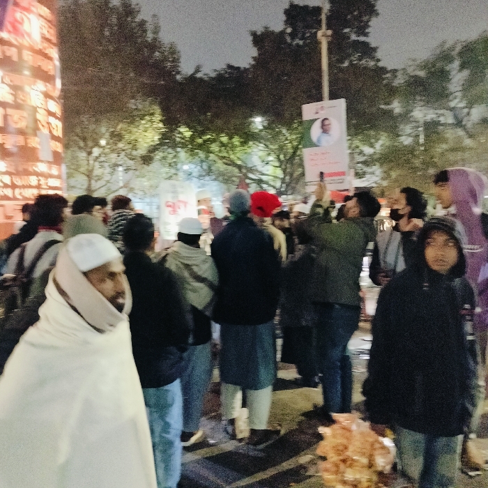 The image depicts a nighttime scene on a public thoroughfare or square in Dhaka, Bangladesh