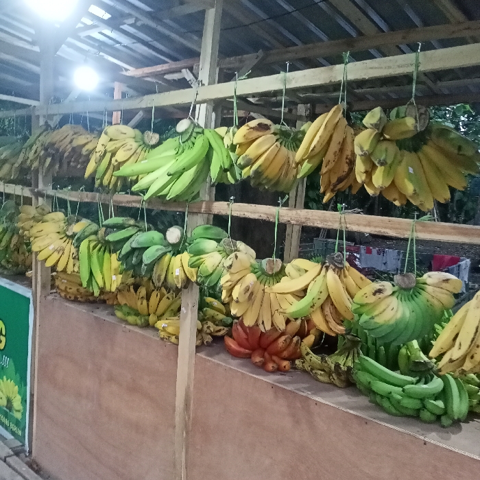 The image displays a market stall under a simple wooden structure featuring a corrugated metal roof, illuminated by an overhead white light fixture