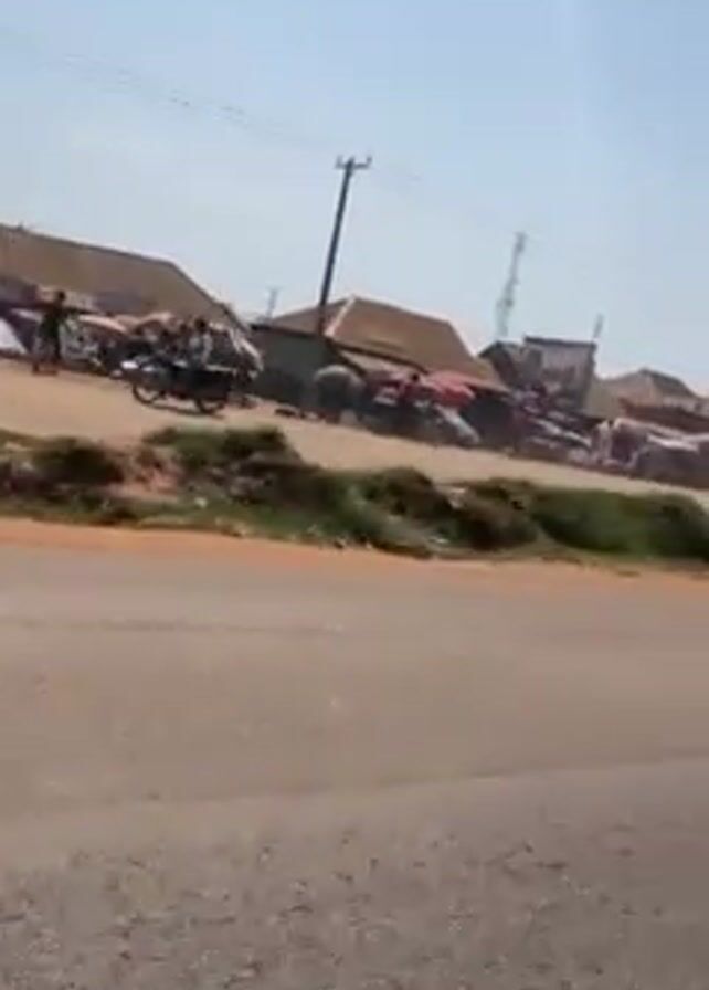 street scene taken from the perspective of someone riding a motorcycle. The road is paved but has a reddish-brown dirt shoulder. On the right side of the road, there are several buildings with corrugated metal roofs and some tents or stalls. The buildings seem to be part of a market or commercial area. People are walking around in the area. In the background, there are utility poles and power lines. The sky is clear and the sunlight is bright. The person filming is riding a motorcycle, and the handlebars and gauges are visible in the lower part of the frame.