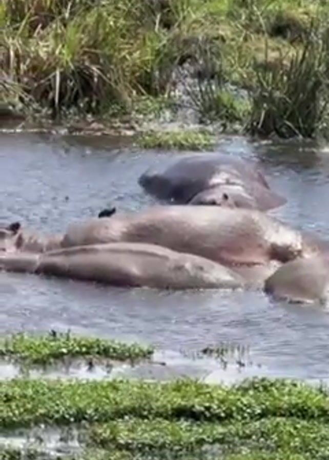 The scene shows a group of hippopotamuses lounging in a body of water, potentially a river or a pond