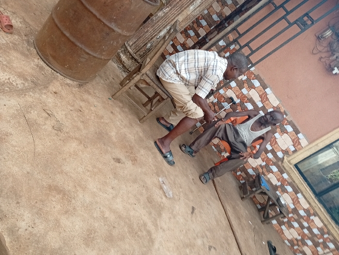 Two older men sit outside on chairs. One man, dressed in a plaid shirt and tan pants, leans towards the other, who wears a tank top and dark pants. A crutch leans against the chair of the man in the tank top. A large metal drum is nearby. The background features a patterned tile wall and a window. The scene appears to be taken in an outdoor or semi-outdoor space.