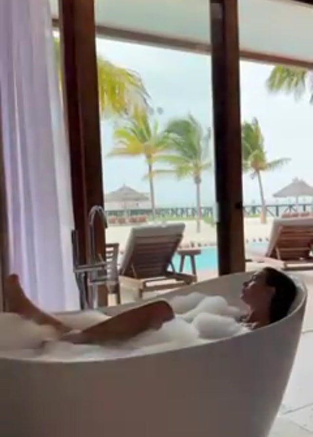 The scene is a woman enjoying a bubble bath in a freestanding white bathtub, situated inside a room with a view of a tropical beach